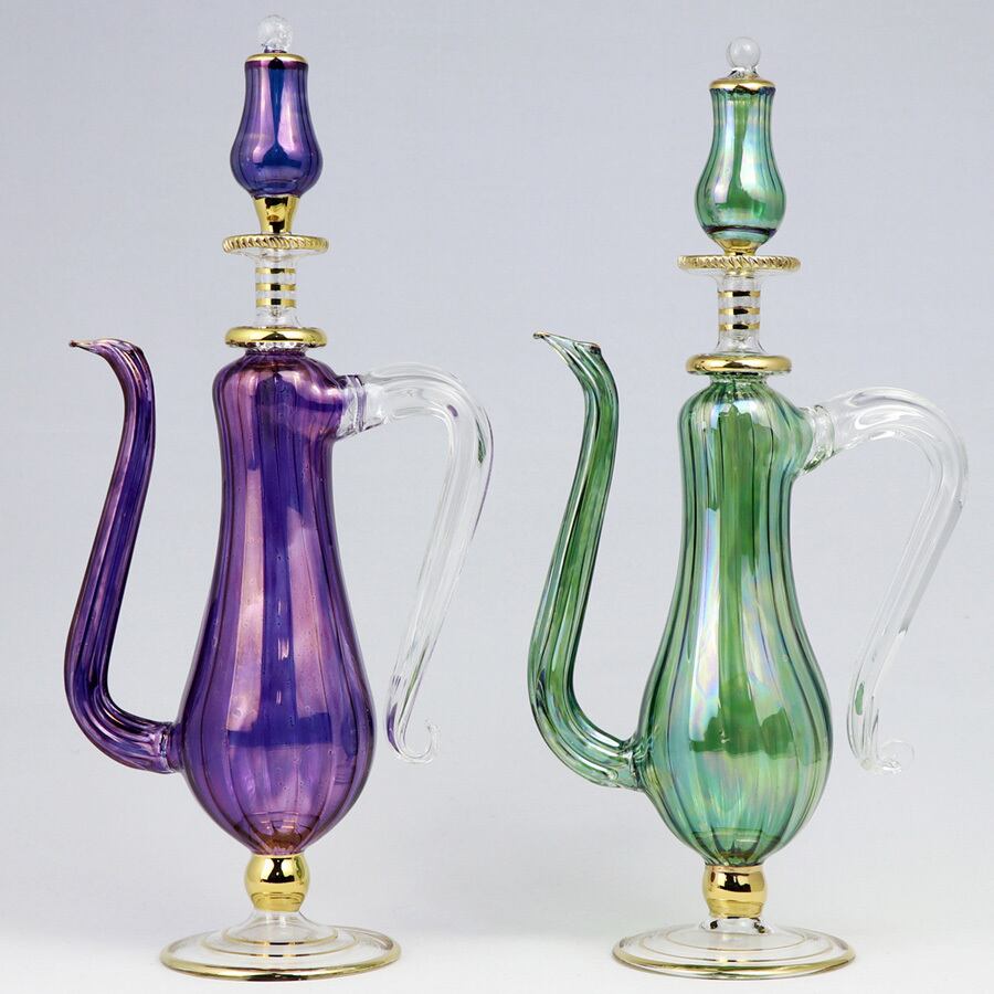 2人の職人がひとつの作品を製作。吹きガラスの手法で成形したガラス瓶に、エジプト人絵付師がハンドペイントで1点1点美しい絵付けを施しています。妖艶なフォルムに巧みなデザイン。パターンはありますが、全てのガラスの配色や形