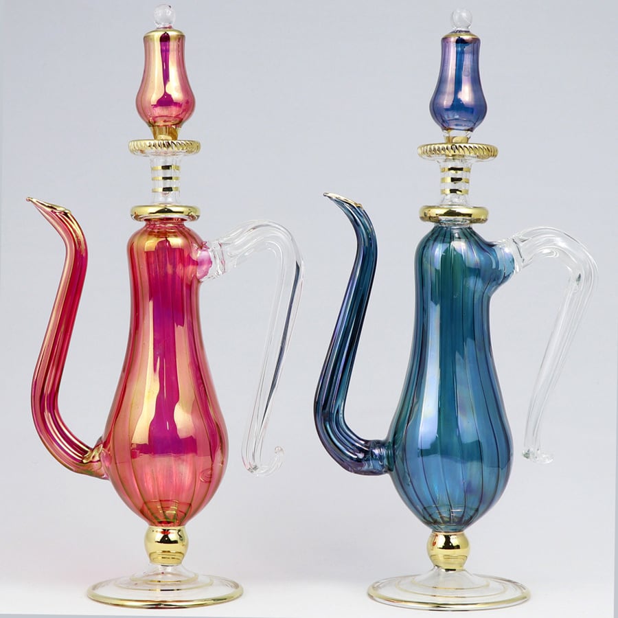 2人の職人がひとつの作品を製作。吹きガラスの手法で成形したガラス瓶に、エジプト人絵付師がハンドペイントで1点1点美しい絵付けを施しています。妖艶なフォルムに巧みなデザイン。パターンはありますが、全てのガラスの配色や形・ゴールドの装飾の入り具合は異なるため、ひとつとして同じものがない工藝品です。