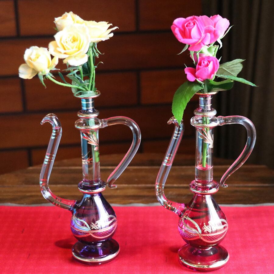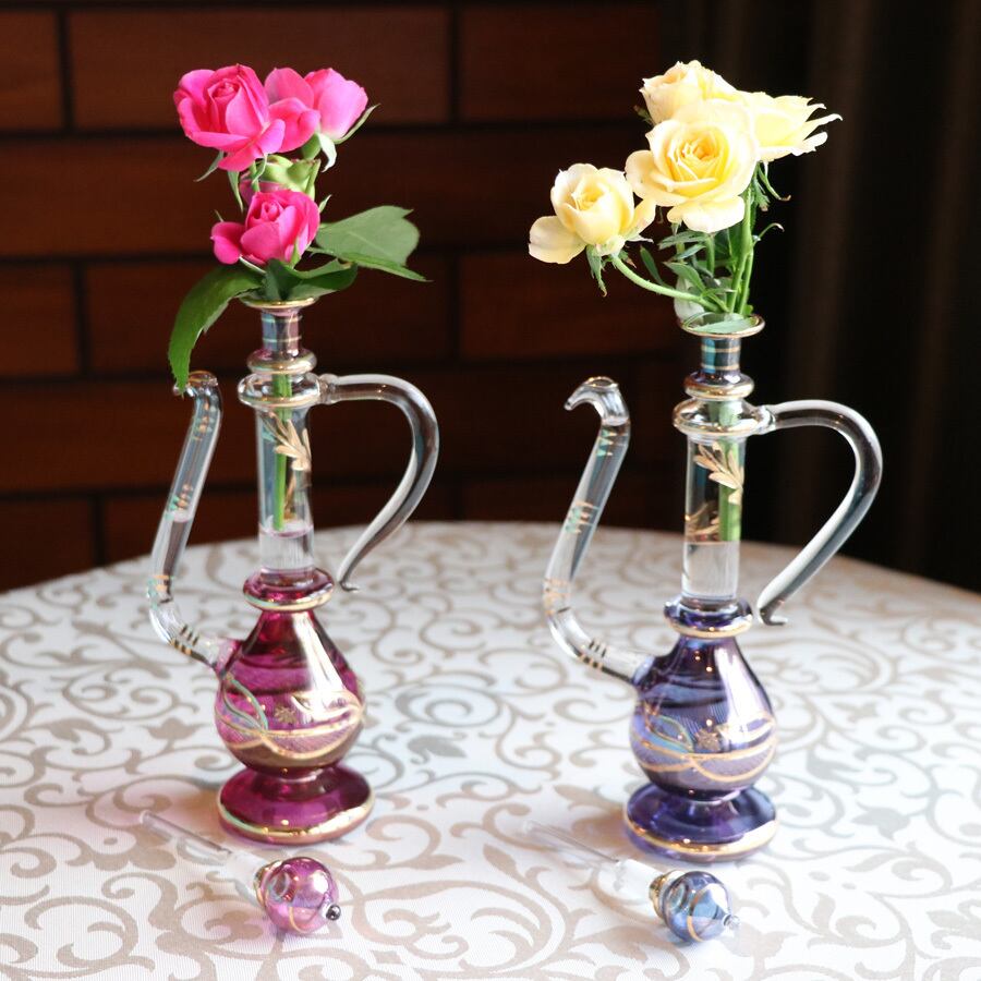スタッフとエジプトガラス関係者がひょんなことから出会い、エジプトガラスに惚れ込み、この度、企画・販売に至りました。エジプト製の美しい香水瓶は香水瓶としてはもちろん、一輪挿しやアロマディフューザーとしてもインテリアを華やかに彩ります。1本でも美しさを堪能できます。数が集まるとまるで別世界に。ゴージャスで気品に満ちたエジプトの風を存分に味わっていただきたいです。