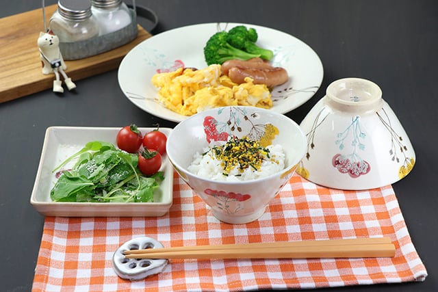 家族でお揃いでも使える、レッドとパープル色がございます。波佐見焼の薄くて軽い器に、手描きのハーブ模様がデザインされています。普段使いにちょうどいい、柔らかな優しい雰囲気の粉引の器。軽いので洗い易く収納し易いのも嬉しいポイントです。