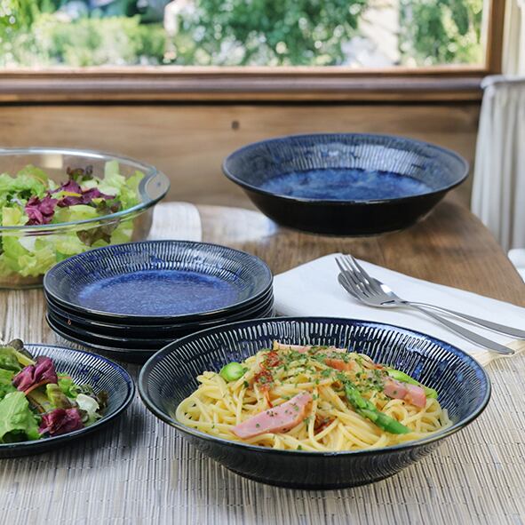 シックな瑠璃色とトチリ模様が美しい、軽量のパスタカレー皿です。毎日のお料理が一気におしゃれに変身します!深さがあり、スープパスタやカレー、シチューなどを美味しく楽しむことができます。また、麻婆豆腐や煮物料理など、幅広い料理に対応できる便利な器です。