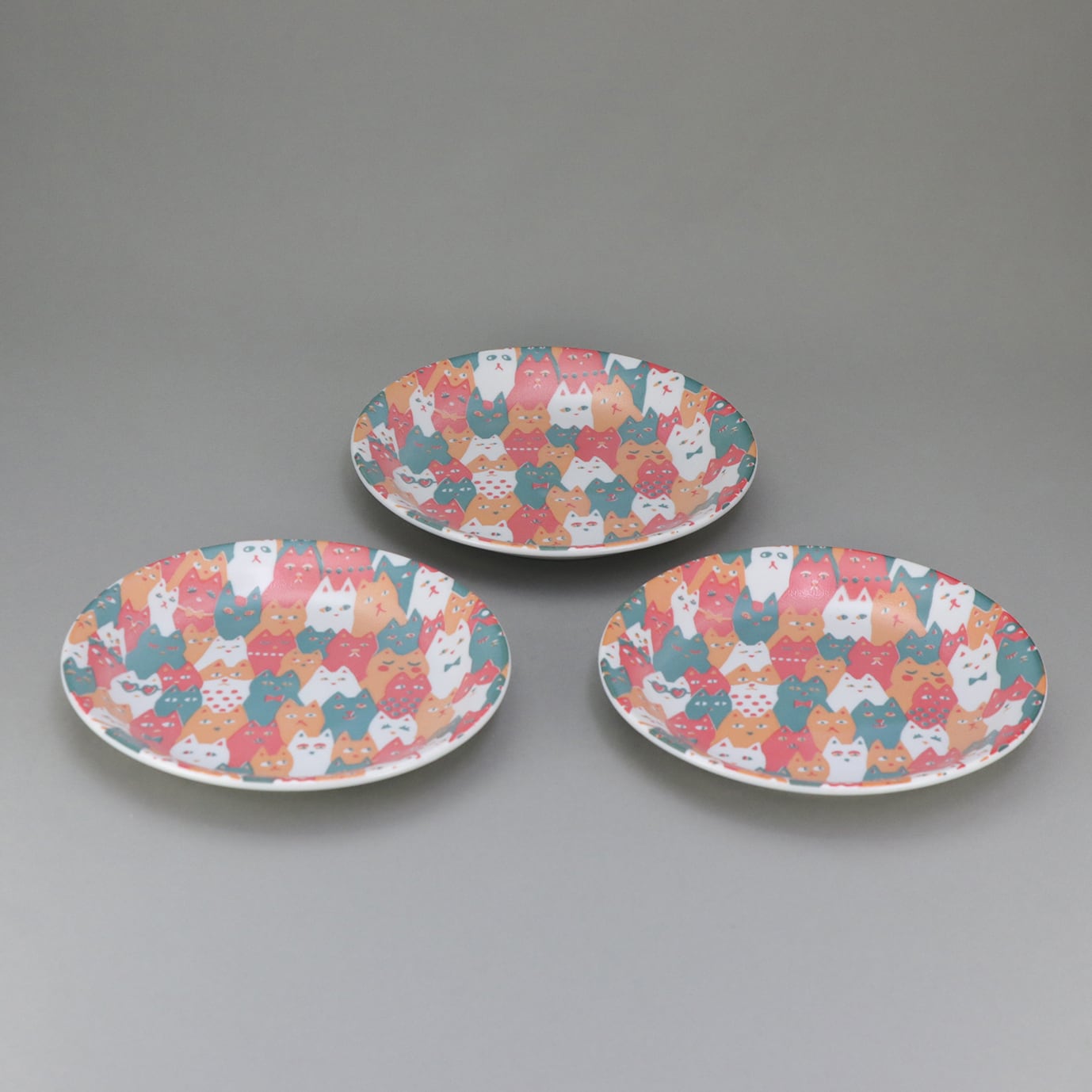 「猫だらけ カラフルプレート 3枚組」は、表情豊かな猫のイラストがカラフルにデザインされた食器です。