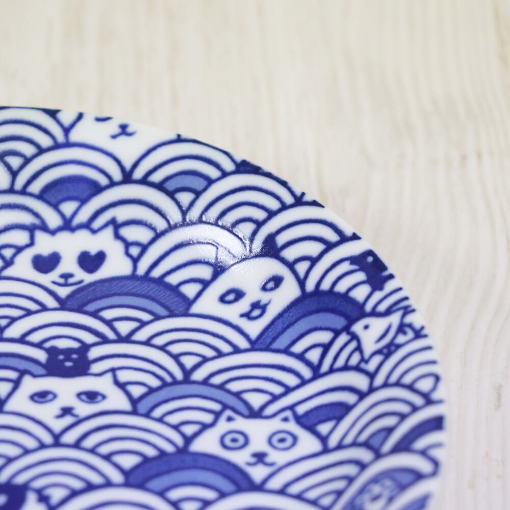 和洋菓子のスイーツ皿や各種料理の取り皿に便利な使いやすいプレートです。古典柄「青海波」と猫だらけのコラボレーションデザインは、デザイナーの佐山愛氏によるもので、各種コンペで多数の受賞歴を持つ高い評価を得ています。