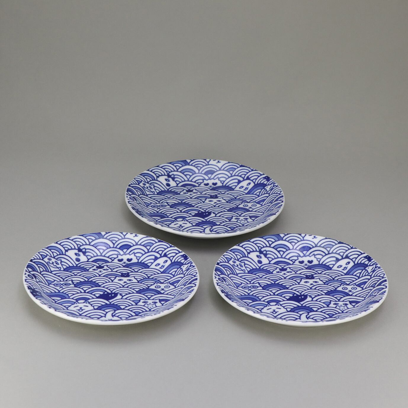「猫だらけ 青海波 プレート 3枚組」は、個性的な猫のイラストが波間から顔を覗かせるユニークな食器です。