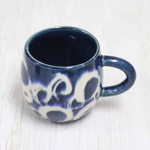 大小様々な円が描かれ、丸みのある胴が特徴のオーシャンマグ。美濃焼の手作り品で、職人の技が光る逸品です。藍の濃淡が美しく、和風テイストのデザインがおしゃれでかわいらしい雰囲気を演出します。手のひらに馴染むサイズ感で、優しく愛らしい形状が魅力的です。
